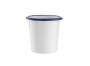 Bicchiere per caffè o liquore in ferro smaltato bianco con bordino esterno blu di forma conica.